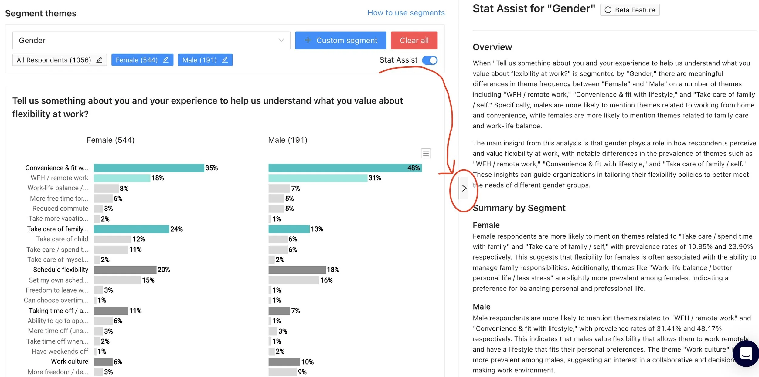Stat Assist helps you surface statistically significant differences across the distribution of open-ended themes — empowering you to quickly spot patterns that can drive smarter strategies and faster decision-making.
