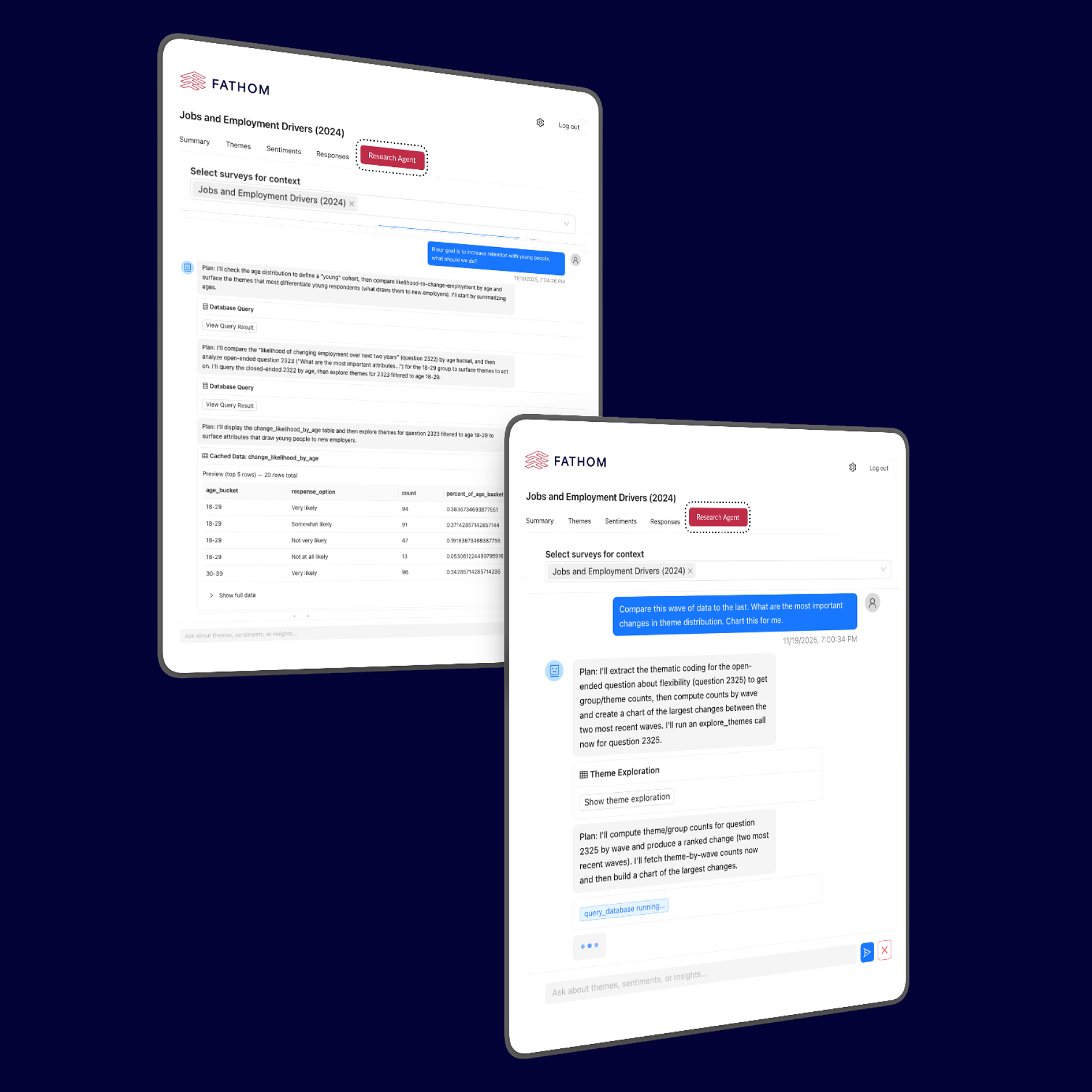 Fathomer clarifies the context you provide, checks its assumptions, and breaks your question into a sequence of analytical steps. It draws from every data source in your Fathom workspace, from the raw text of verbatims and customer feedback to the detailed thematic and sentiment codes Fathom has applied, plus all quantitative variables including demographics, attitudinal measures, and behavioral metadata. It can dive deep on a single survey or synthesize insights across long-running trackers.