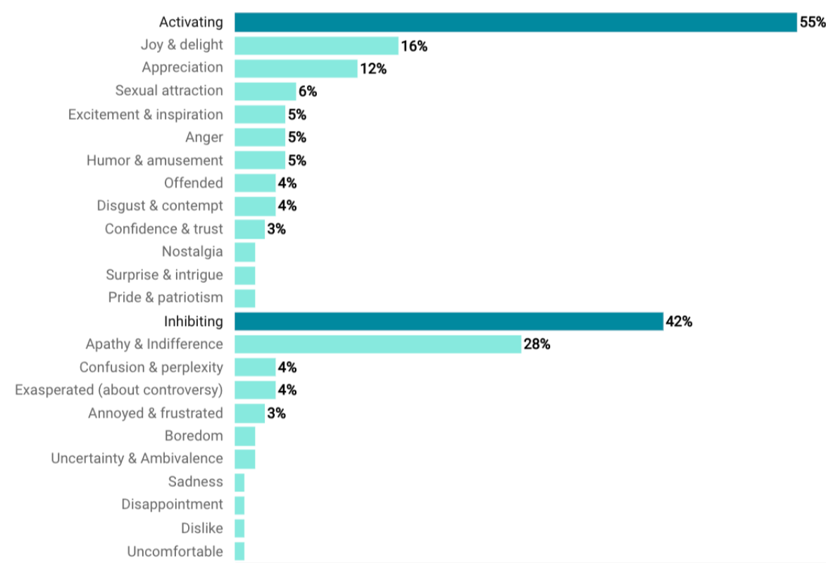 55% feel activating emotions (~2/3rds positive / 1/3 negative)